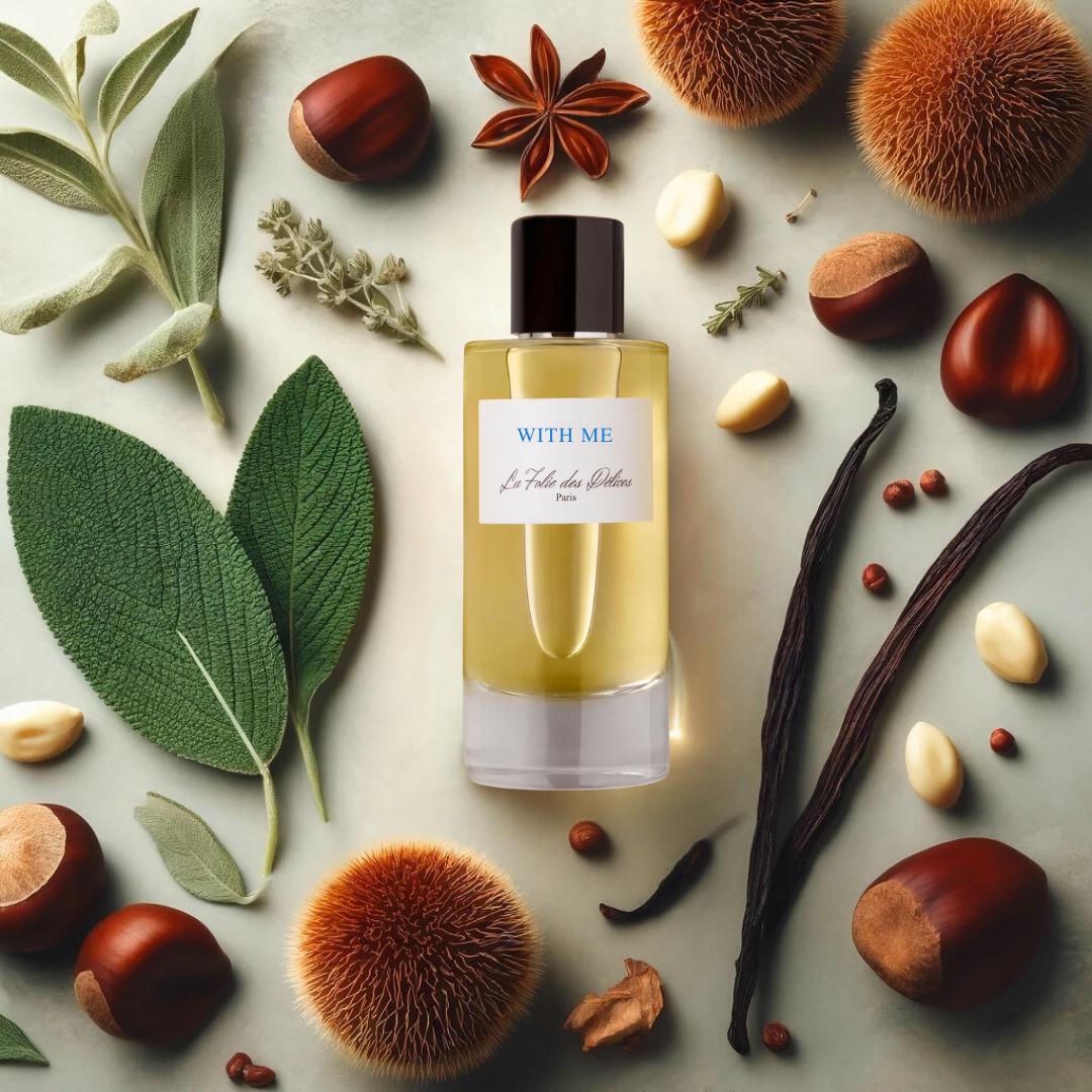 Met zijn bedwelmende topnoten van kastanje en suiker, begroet With Me je zintuigen met een zoete en warme omhelzing, waardoor een gevoel van comfort en geborgenheid ontstaat. Het hart van de geur wordt gevormd door de frisse en aromatische tonen van salie en lavendel, die een verkwikkende en kalmerende sensatie creëren. Terwijl de geur zich ontvouwt, onthult de basis van vanille en rook een diepere, sensuele dimensie, waardoor een blijvende indruk van verfijning en mysterie achterblijft.